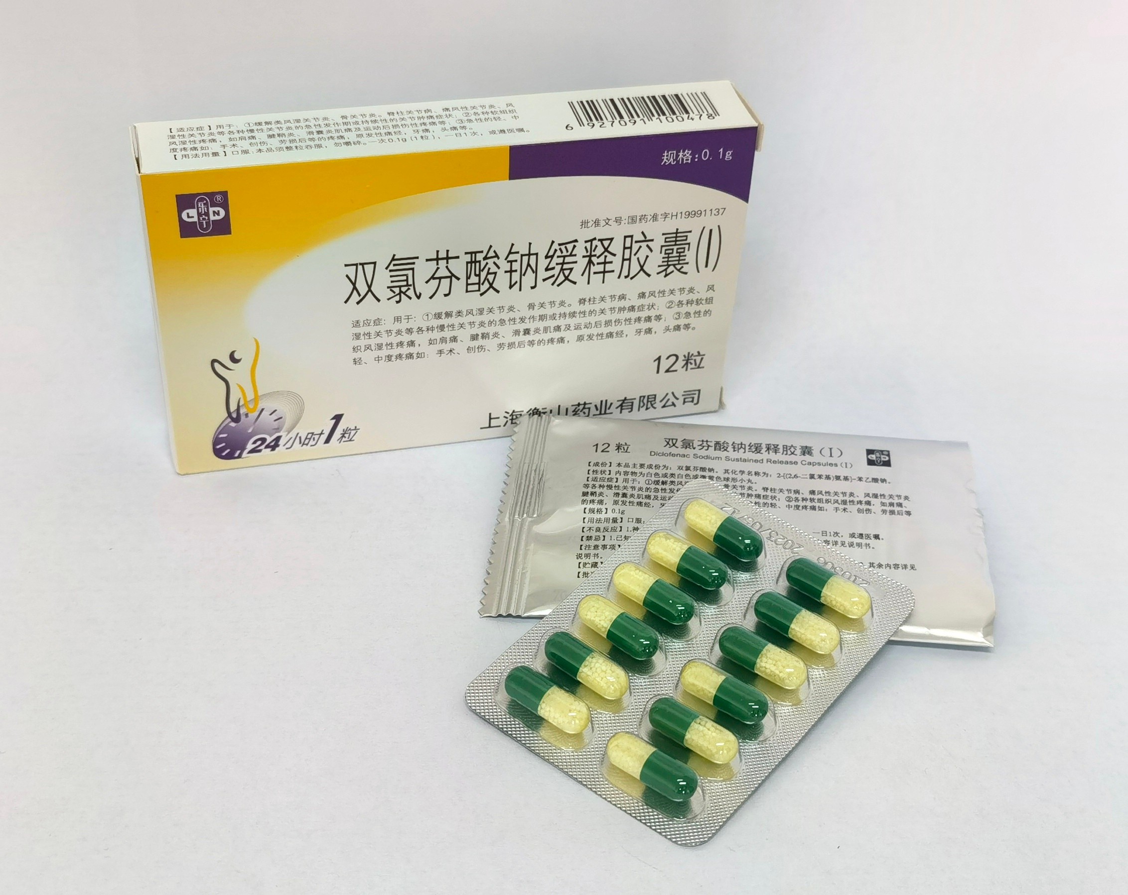 適應(yīng)癥: ①緩解類風(fēng)濕關(guān)節(jié)炎、骨關(guān)節(jié)炎。脊柱關(guān)節(jié)病、痛風(fēng)性關(guān)節(jié)炎、風(fēng)濕性關(guān)節(jié)炎等各種慢性關(guān)節(jié)炎的急性發(fā)作期或持續(xù)性的關(guān)節(jié)腫疼癥狀;②各種軟組織風(fēng)濕性疼痛,如肩痛、腱鞘炎、滑囊炎肌痛及運動后損傷性疼痛等;③急性的輕、中度疼痛如:手術(shù)、創(chuàng)傷、勞損后等的疼痛,原發(fā)性痛經(jīng),牙痛,頭痛等。規(guī)格:0.1g包裝規(guī)格:12粒/盒備注:醫(yī)保甲類批準(zhǔn)文號:國藥準(zhǔn)字H19991137產(chǎn)品名稱:雙氯芬酸鈉緩釋膠囊(I)英